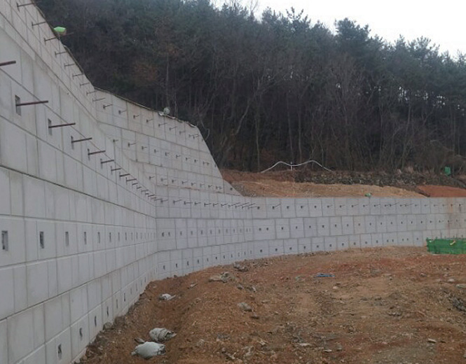 Soil nail과 P.C Panel을 이용하여 예상파괴 토체의 전단강도를 증가시키고, 일종의 중력체를 만들어 토압에 저항하여 비찰면을 안정화 하는 공법입니다. 본 공법은 도로, 철도, 공장부지 및 택지개발과 같은 공사에 필요한 사면 안정화와 부지의 효율성에 있어 기존의 보강토 옹벽 또는 일반 RC옹벽으로 적용하기 어려운 위치에 사용됩니다. 시공은 현장 여건에 따라 다르나 대부분 하향식(Top Down)으로 진행되며, 공정상 필요 시 상향식(Down Up) 시스템으로도 공사가 가능합니다.